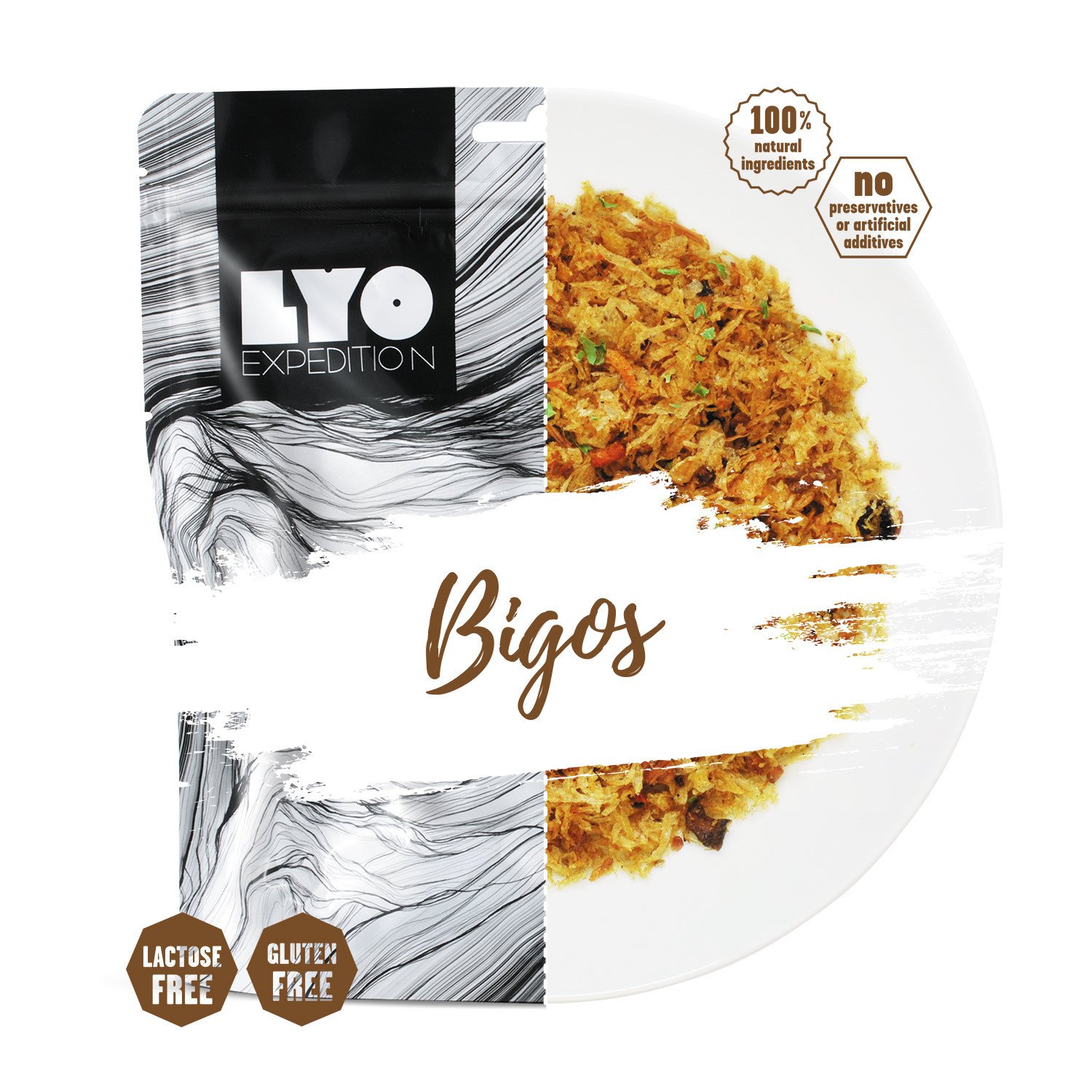 LYO EXPEDITION Gerichte weisen eine lange Haltbarkeit auf. Da der Wassergehalt beim Gefriertrocknungsprozess entzogen wird, haben Mikroorganismen und Enzyme keine Chance zur Entfaltung. Die Gerichte sind luftdicht verpackt und mit einem Sauerstoff-Absorber versehen.