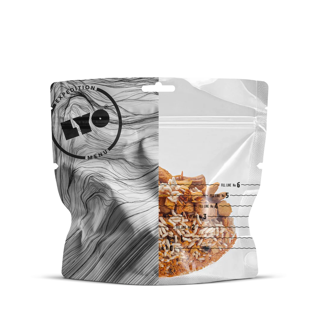 Die LYO EXPEDITION Verpackungen wurden entworfen um leicht zu sein und in der selben Zeit eine angenehme Zubereitung der LYO Mahlzeit zu genehmigen.