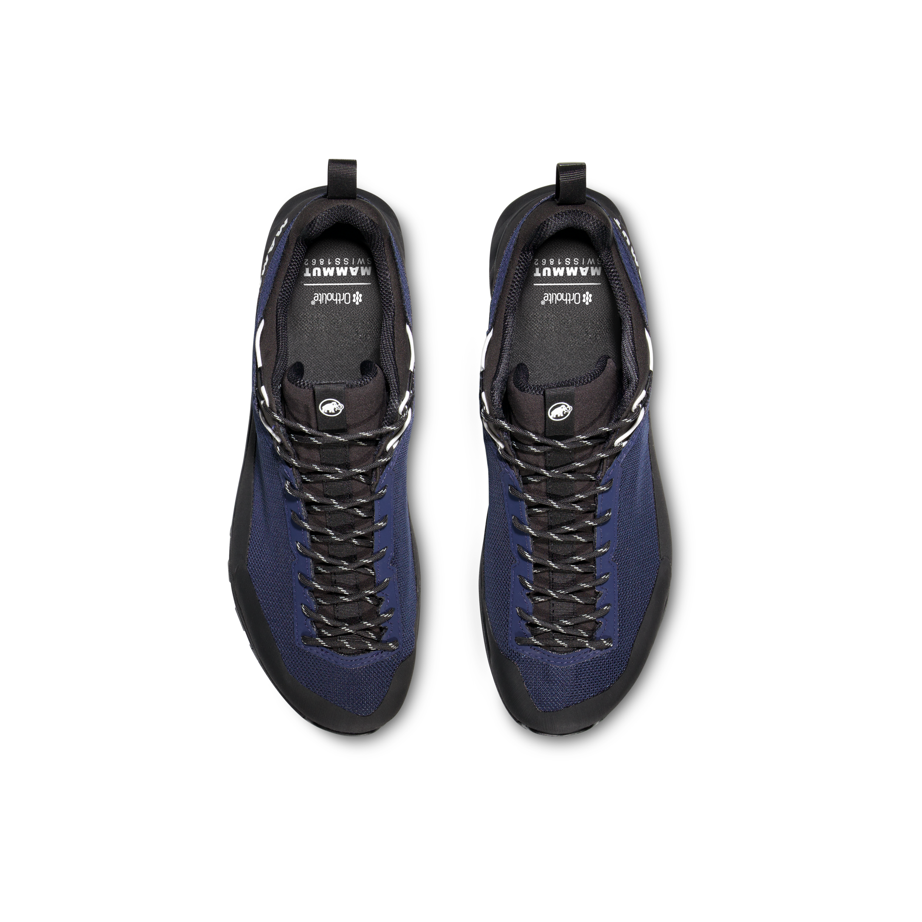 The Vibram® XS Trek outsole with Traction Lug™ is built for a high level of grip, and in the product benefits section Mammut also highlights a climbing zone for dependable traction and durability on unpredictable terrain. Additional protection comes from the rubber toe cap and raised rubber rand, which improve durability and help shield the shoe on rocky and abrasive surfaces.
