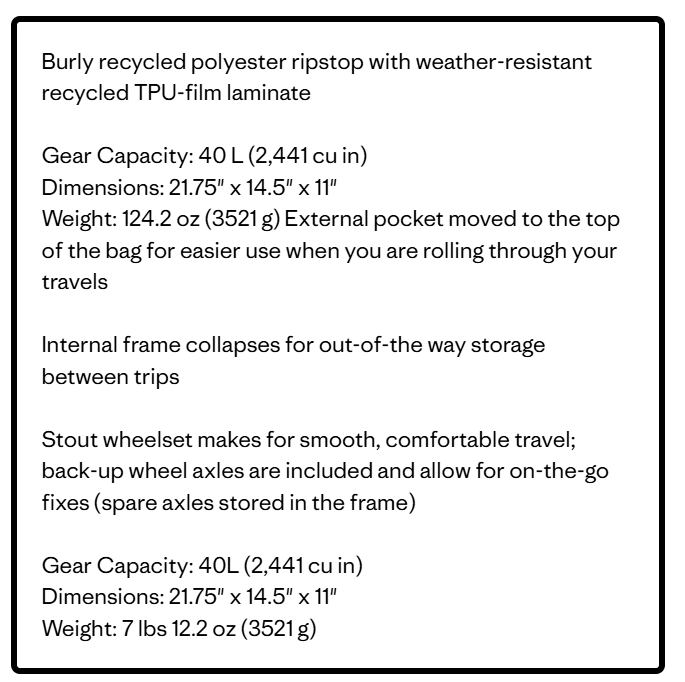 Black Hole® Wheeled Duffel 40L is carry-on approved and ready for burly journeys. It delivers the same legendary performance you expect from our Black Hole® bags, but with a huge step toward environmental impact reduction with 100% recycled body fabric, lining and webbing, and now a pioneering recycled TPU-film laminate with a sleek matte finish.