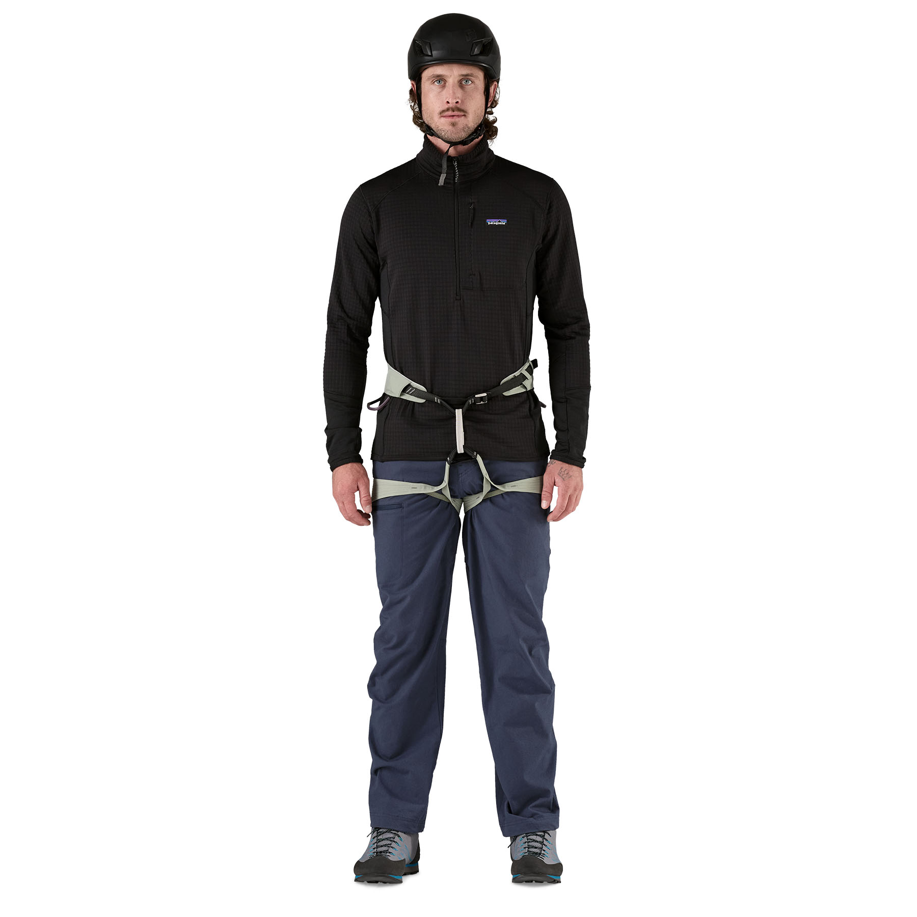 Two top-entry rear pockets create a reinforced seat for added durability; zippered right-thigh security pocket sits comfortably above the knee and below harness leg loops