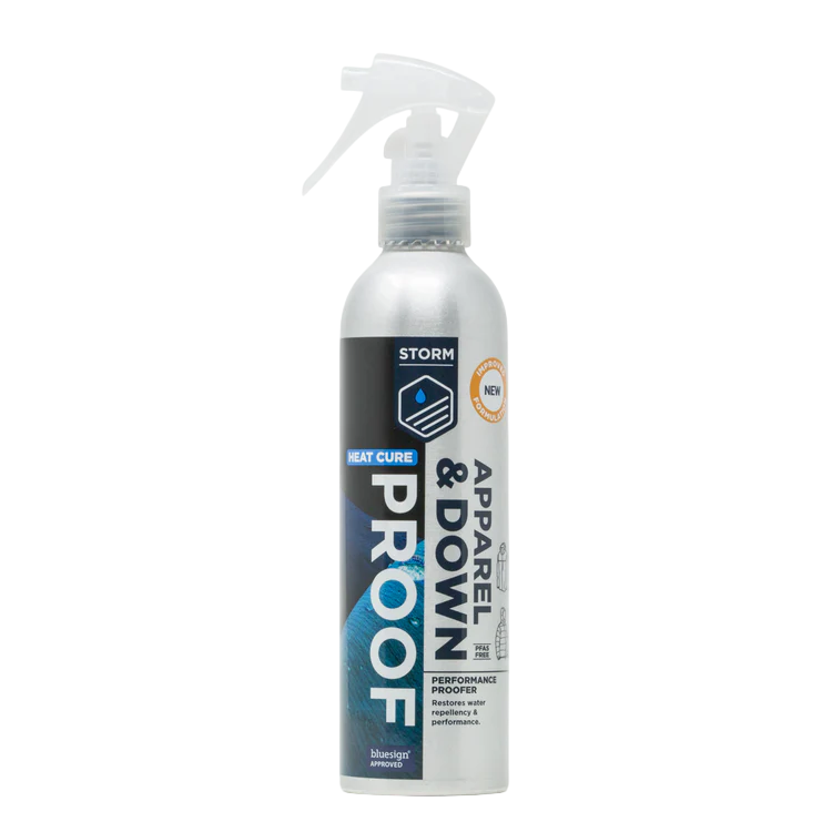 Storm Apparel Proofer Spray (Heat Cure) is a high-performance waterproofing treatment designed to restore the durable water-repellent (DWR) finish of technical clothing and outdoor gear. The spray format allows precise application to high-wear areas, while the heat-activated formula bonds to the fabric during drying to create a durable, abrasion-resistant finish. It enhances water repellency without compromising breathability, making it ideal for maintaining waterproof jackets and performance apparel.