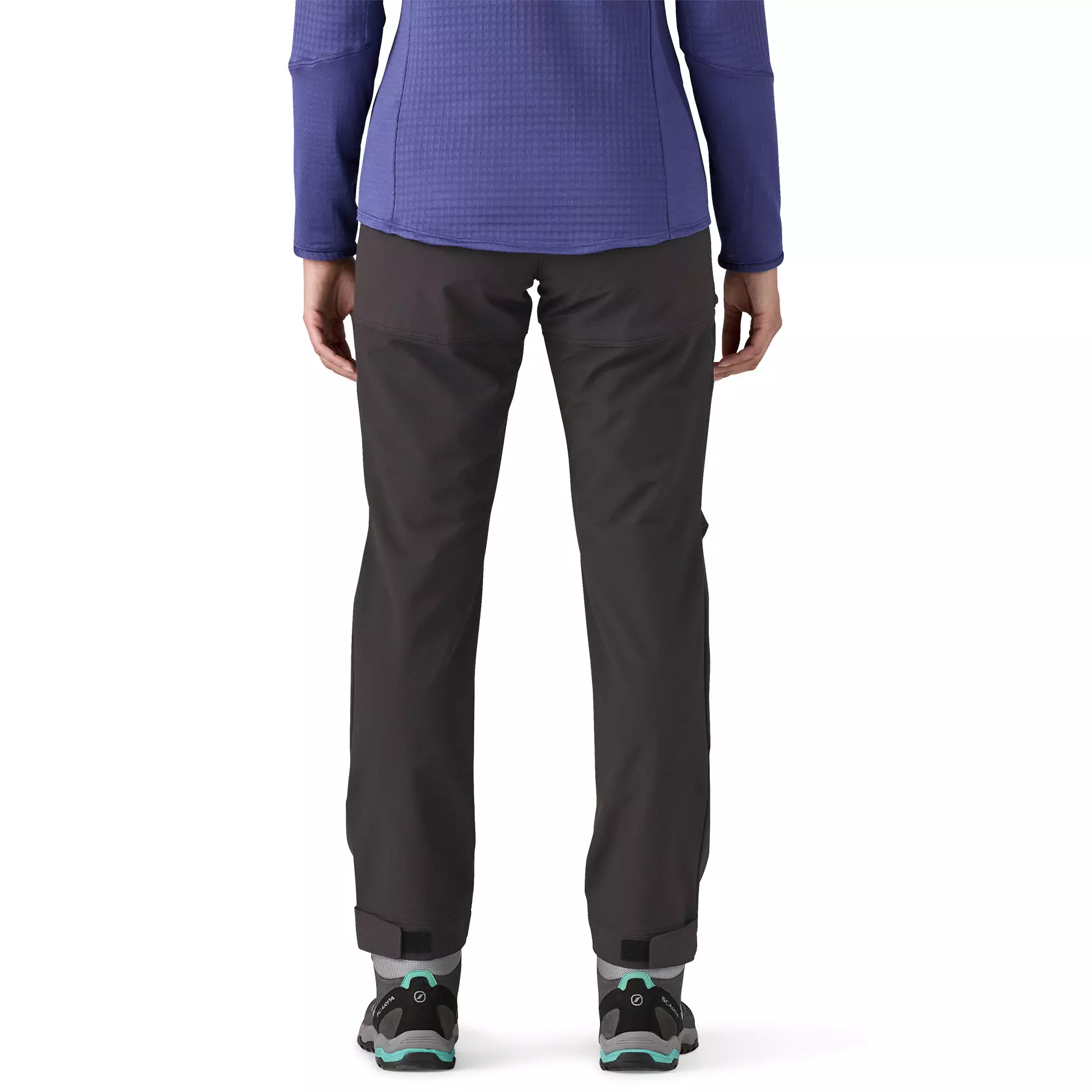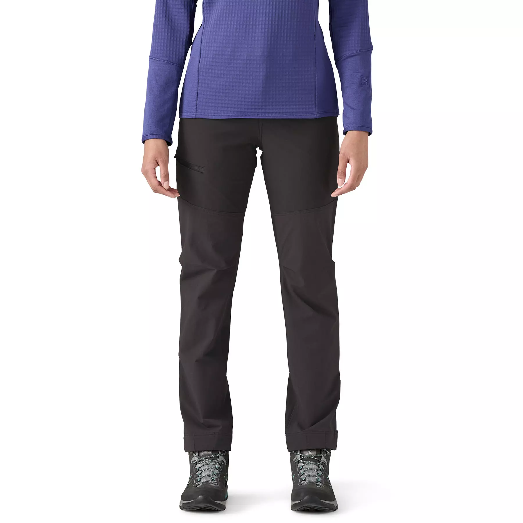 Gusseted crotch and prominent knee articulation for freedom of movement; designed for a sleek fit under a backpack waistbelt or a harness