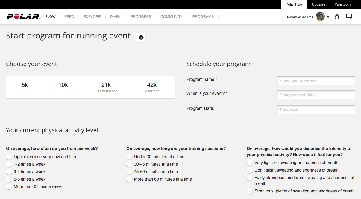 Програмата за бягане е план за бягане, изработен специално за вас и вашите нужди. Вие избирате между възможните дистанции - 5K, 10K, полумаратон или маратон, след което въвеждате датата на състезанието. Програмата взема данни от предишните ви тренировки (ако имате достатъчно записани такива в Polar Flow),проучва сегашното ви ниво на подготовка и да секунди изработва персонална програма за бягане за вас.