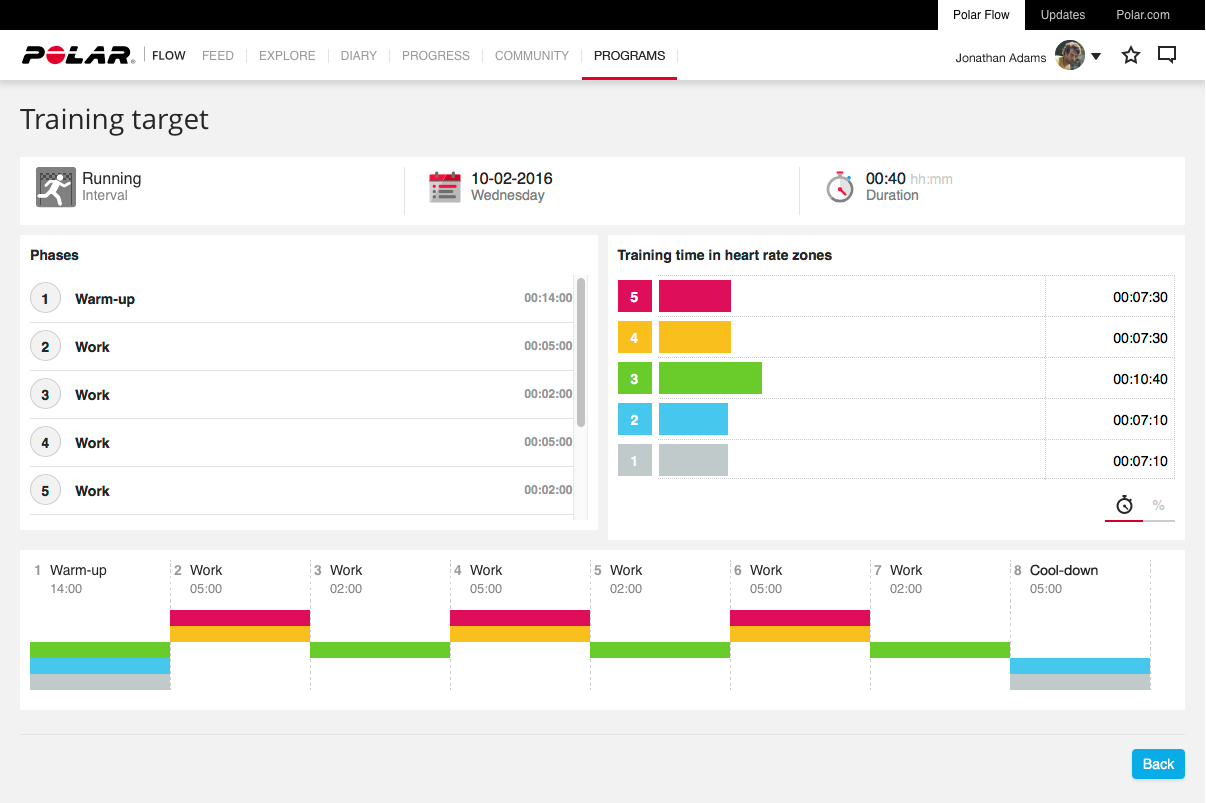 След като синхронизирате вашия План за бягане от Polar Flow с часовника си, може да започнете тренировъчна сесия, директно от изгледа към Дневника на часовника си. Ако правите сесията за интервални тренировки, която разгледахме по-горе, вашият Polar M400 ще ви преведе през тренировката, след като изберете тази тренировъчна сесия и натиснете старт.