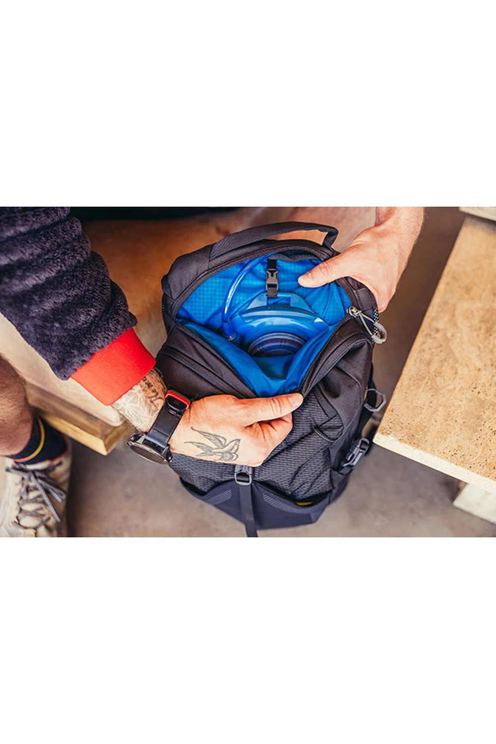 - Independent zippered pocket for hydration reservoir with routing to harness, or space for your tablet
