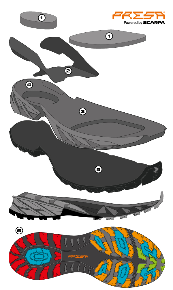 • 5. RUBBER OUTSOLEdeveloped by SCARPA with SuperGum rubber compound for grip and agility