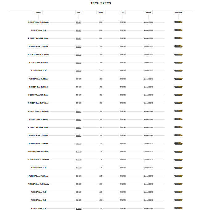 Новото поколение PZERO Race TLR е най-високоефективната гума в продуктовата гама на Pirelli и първата безкамерна гума, произведена изцяло в Италия. Въвеждането на технологията SPEEDCORE в корпуса с плътност 120 TPI включва слой от каучукова смес с добавени арамидни влакна, който покрива вътрешната част на гумата, като по този начин подобрява както гладкото търкаляне, така и дълготрайността на материала. Резултатът е гума с по-малка твърдост и осезаемо по-висока скорост. Каучуковата смес продължава да използва усъвършенстваната технология SmartEVO, която се прилага и в други високопроизводителни модели от серията PZERO.
