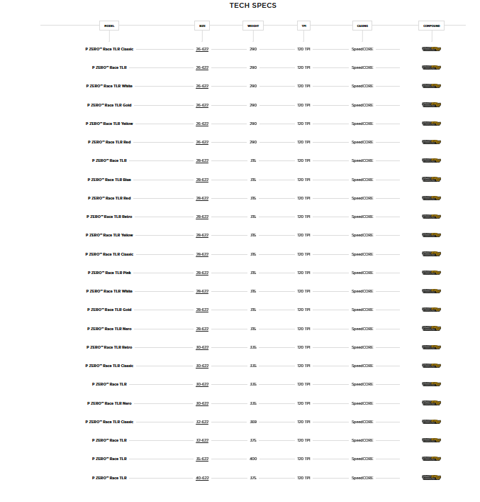 SpeedCORE™ е иновативна конструкция, готова за безкамерни гуми, разработена от Pirelli (в процес на патентоване) за нашите високопроизводителни велосипедни гуми, която представлява най-усъвършенстваната ни TLR технология до момента. Произведена от автомобилното ноу-хау на Pirelli и осъществена благодарение на най-новия ни производствен завод в Италия, в близост до централата ни в Милано, конструкцията SpeedCORE™ се състои от тънък въздухонепроницаем слой каучукова смес, примесена с арамидни частици. Този слой покрива вътрешната част на гумата и благодарение на наличието на арамид в каучуковата смес позволява по-добра механична устойчивост, по-добро задържане на въздуха и като цяло по-голяма гъвкавост: всичко това допринася за цялостното представяне на гумата.